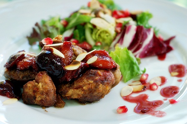 wątróbka z sałatą, śliwkami, granatem i migdałami