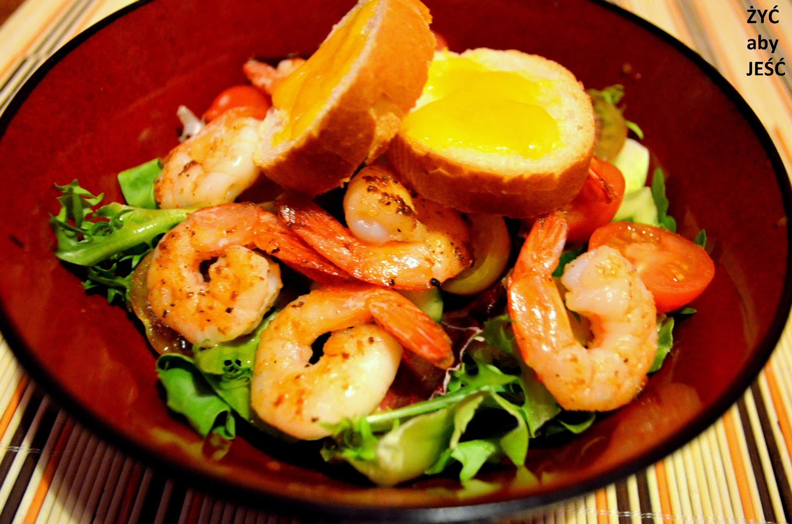 Na talerzu układamy nasz mix sałat, polewamy sosem, wrzucamy pomidory, układamy krewetki i podajemy z chrupiącą bagietką.